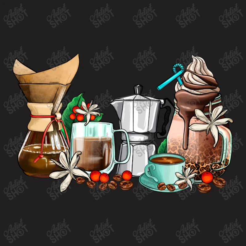 Digital printing is an amazing process that involves your artwork “Coffee Tools Coffee Cups” being processed by a computer and then printed directly onto the surface of your product. Digital printing is not a heat transfer or applique, as the ink directly adheres to the fabric of your shirt. Each printing process has its strengths, and our artwork team will weigh these when deciding which to use for your art.