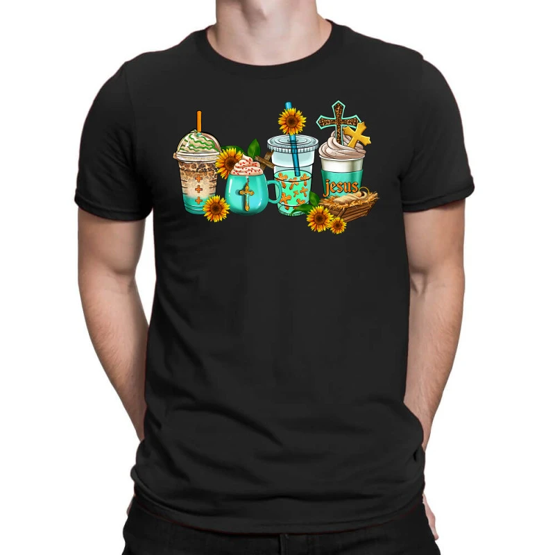 Plot Printing Consists of both Flock and Flex Print, This process transfers your artwork “Jesus Coffee Cups” from a special foil through an immense amount of pressure and heat. Flex images are smooth, a little plastic like and a tad bit glossy. Flock images have a fuzzy velvet-like texture and appear slightly more elevated. Think of drawing just the shadows and how that would appear without color. 3 colors plus the color of the garment itself is used to print.
