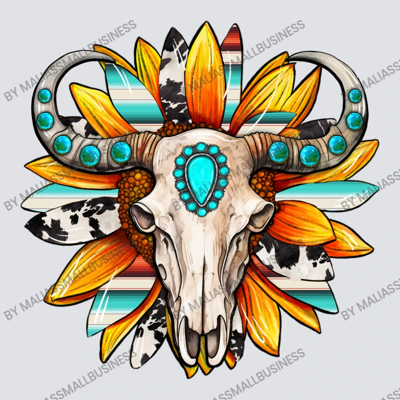 Digital printing is an amazing process that involves your artwork “Western Bull Skull Sunflower” being processed by a computer and then printed directly onto the surface of your product. Digital printing is not a heat transfer or applique, as the ink directly adheres to the fabric of your shirt. Each printing process has its strengths, and our artwork team will weigh these when deciding which to use for your art.