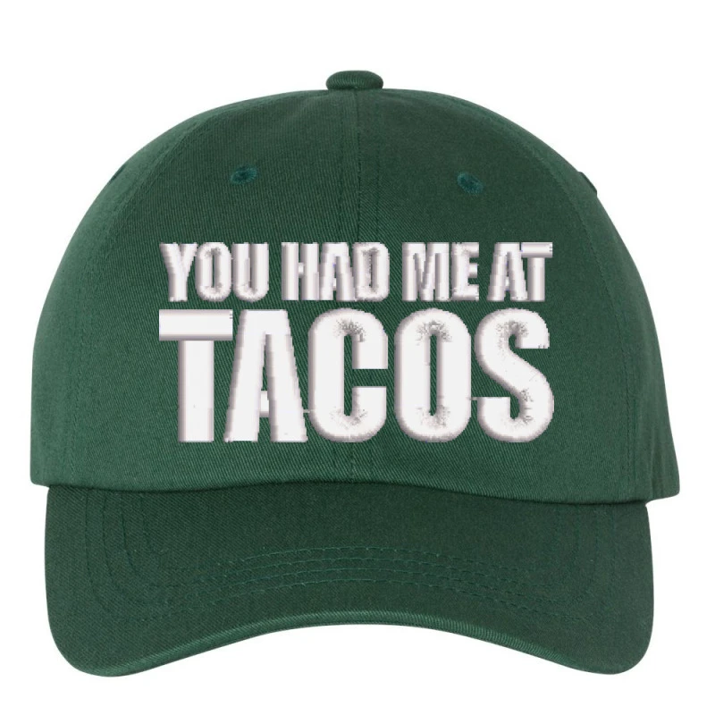 This You Had Me At Tacos embroidered hat is available in a vast array of color options,